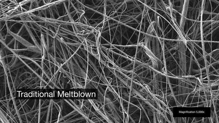 - Incredibly fine mechanical filter (electrospun nanofibers) works better than traditional meltblown